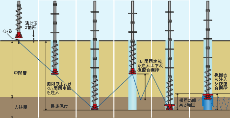 | 作業内容 | 根固め部の築造終了後、縮翼状態にて杭周固定液を注入しながらオーガーヘッドを正回転で引き上げる。 | 鋼管杭の下ぐいを吊り込み、鉛直性を保持しながら掘削孔の中心部に建て込み、挿入する。 | 下ぐい頭部をGLで固定し、鉛直性を保持しながら中ぐいもしくは上ぐいを建て込み、現場溶接を行う。 | くいを自重で掘削孔内に挿入した後、自沈またはくい頭部に回転キャップを取り付け、回転圧入により、所定の深度までくいを沈設する。 | くいの天端をレベルにて確認し、くいを固定する。(くいが自沈する場合は落下しないよう専用治具等で固定する。) |